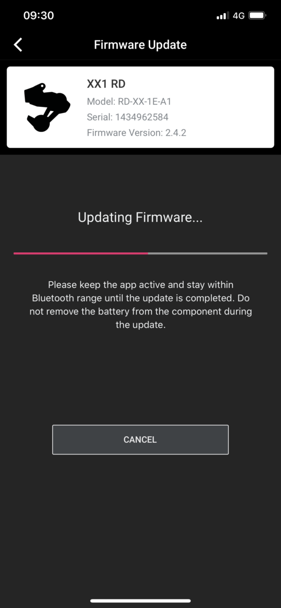 Réveillez les deux éléments en mettant en mouvement le pédalier, afin que votre smartphone les détecte. La communication s’effectue par le biais du Bluetooth. Laissez-vous guider sur l’application en cliquant sur l’image du dérailleur pour vérifier la présence d’une mise à jour. Pour l’installer, il suffit de réaliser une pression sur le bouton se trouvant sur le devant du dérailleur pour débuter l’installation de la mise à jour. Le voyant passe au clignotant et la procédure démarre. C’est identique pour la commande vitesse.