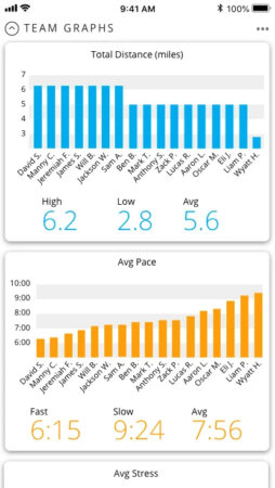 Les coachs peuvent suivre les performances individuelles d’un athlète mais aussi d’une équipe entière. Ils ont ainsi accès à l’allure, le kilométrage, les temps des séries, les dynamiques de course (Running Dynamics), la VO2 Max et toutes les données environnementales de la séance telles que la météo, la température, le niveau d’humidité et la vitesse du vent.